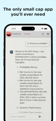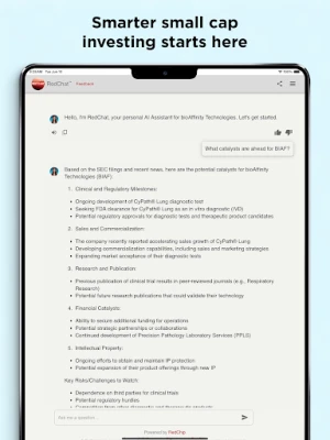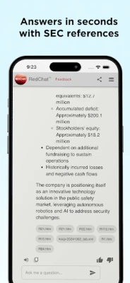 في قلب **RedChat**، يكمن محرك ذكاء اصطناعي متطور، تم تدريبه بشكل مكثف على آلاف الإفصاحات المالية وتقارير الشركات. تتيح لك ميزة الدردشة التفاعلية طرح الأسئلة بلغة طبيعية، تماماً كما تتحدث مع خبير مالي، لتحصل على ملخصات سريعة وشاملة. استكشف الجوانب المالية، والمخاطر المحتملة، ونماذج الأعمال، وحتى "علامات الخطر" لأي شركة مدرجة في ناسداك أو بورصة نيويورك بكل سهولة. يضمن لك هذا النهج الحصول على صورة واضحة ومحدّثة، مما يمكنك من تقييم الفرص والمخاطر بثقة أكبر.